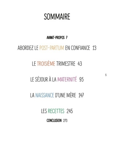 Prolongement des trois trimestres que dure une grossesse, le quatrième trimestre commence certes par la naissance d'un enfant mais aussi par celle d'une mère. Julia Simon, naturopathe spécialiste en périnatalité, vous accompagne pour préparer les premiers mois de votre nouvelle vie de maman. Alimentation et micronutrition, activité physique, soins, relaxation, utilisation des plantes, acceptation des émotions, gestion du temps ou encore sexualité... Ce livre offre des réponses, des conseils et des recettes pour adopter de nouveaux réflexes et profiter pleinement de cette étape, parfois délicate, toujours enrichissante. Sans tabou et avec bienveillance, l'auteure vous propose de profiter de son expertise mais aussi des nombreux témoignages de professionnels de santé et d'autres mamans. Reconnectez-vous en douceur, émotionnellement et physiquement, à la femme que vous êtes et à la mère que vous devenez.